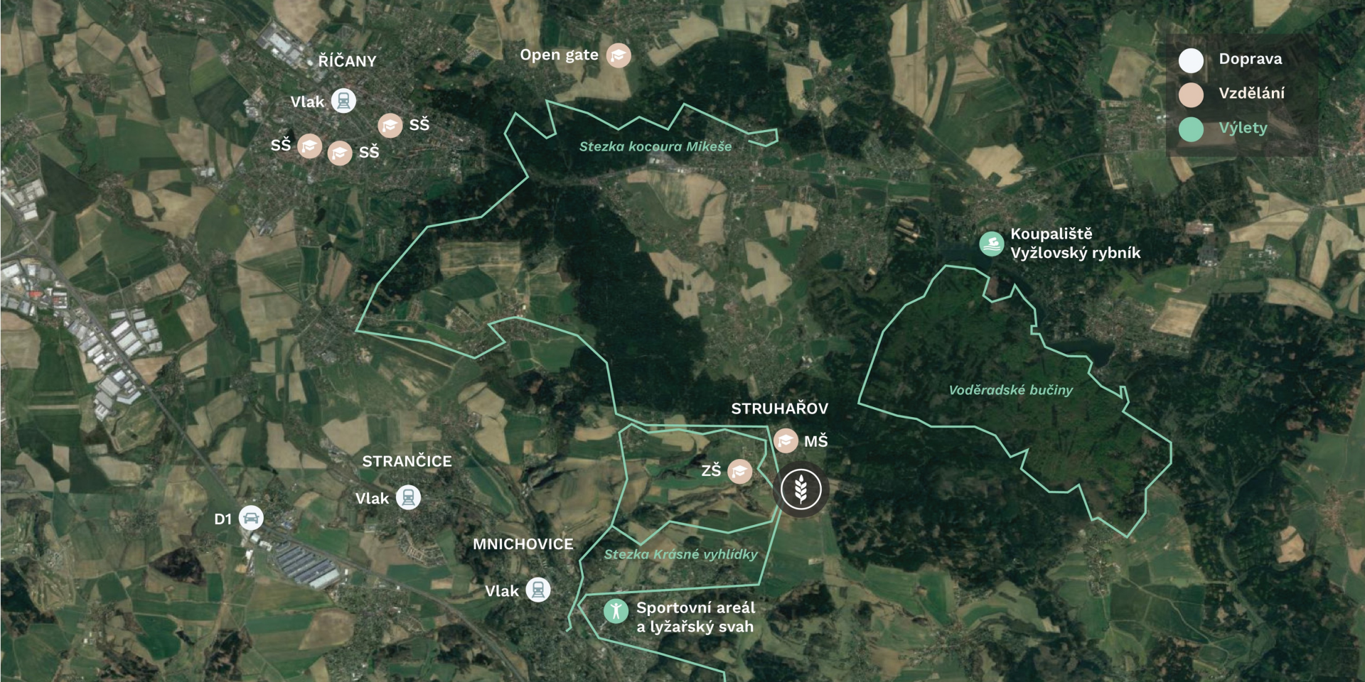 V blízkém okolí naleznete soustavu rybníků na Jevanském potoce s letním přírodním koupáním, bývalé kamenolomy a jejich charakteristické scenerie, malebné louky a pole s výhledy do středočeské krajiny. Každodenní procházka i celodenní výlet jsou zde otázkou několika kroků od domova.